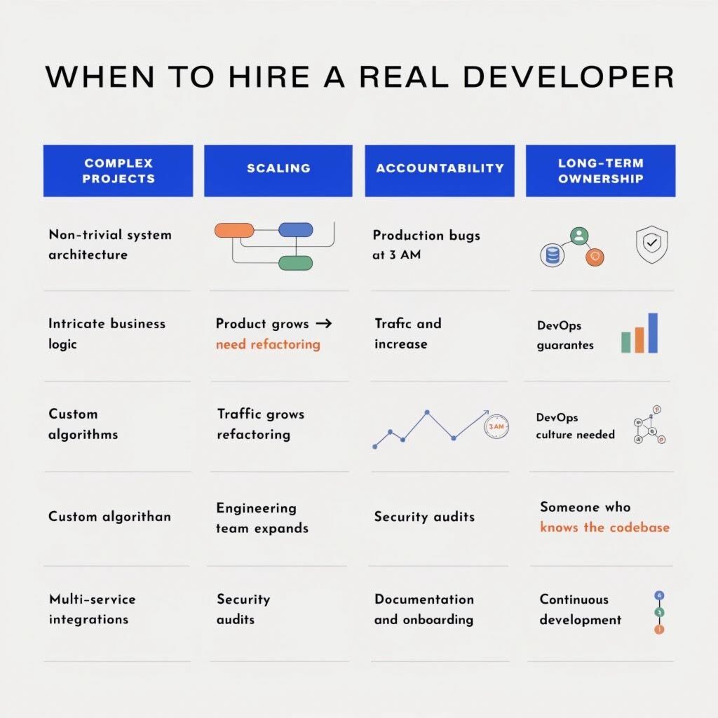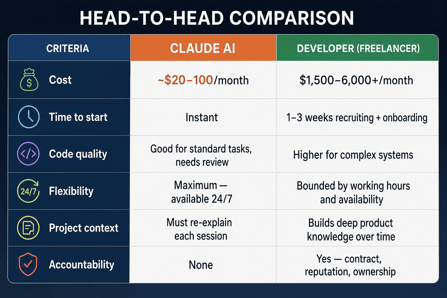 Not long ago, "should I hire a developer?" had an obvious answer: yes, if you want a product. But the market has shifted. Claude and other AI assistants can write code, reason about architecture, and generate entire components in seconds. So founders, PMs, and solo builders are now asking a genuinely reasonable question: do I actually need to hire anyone?